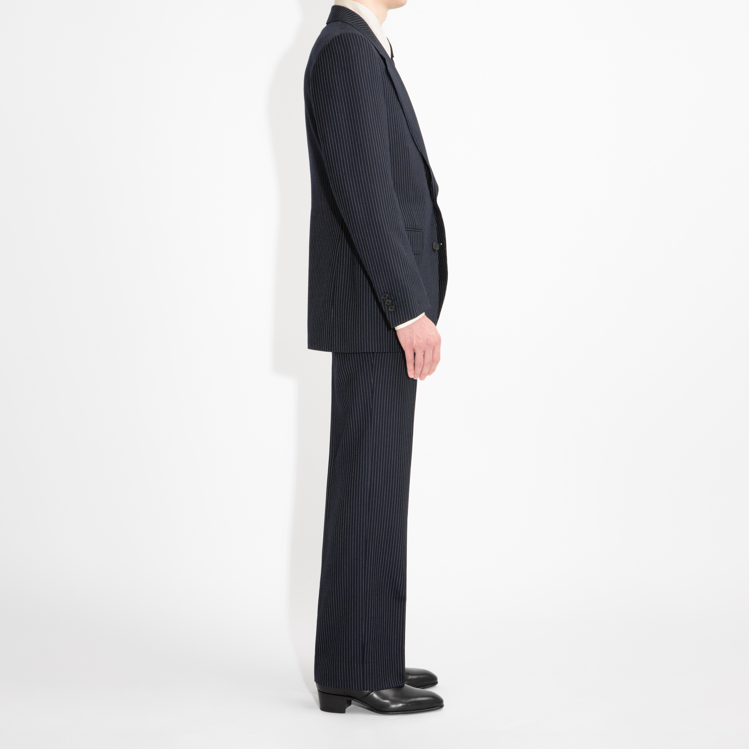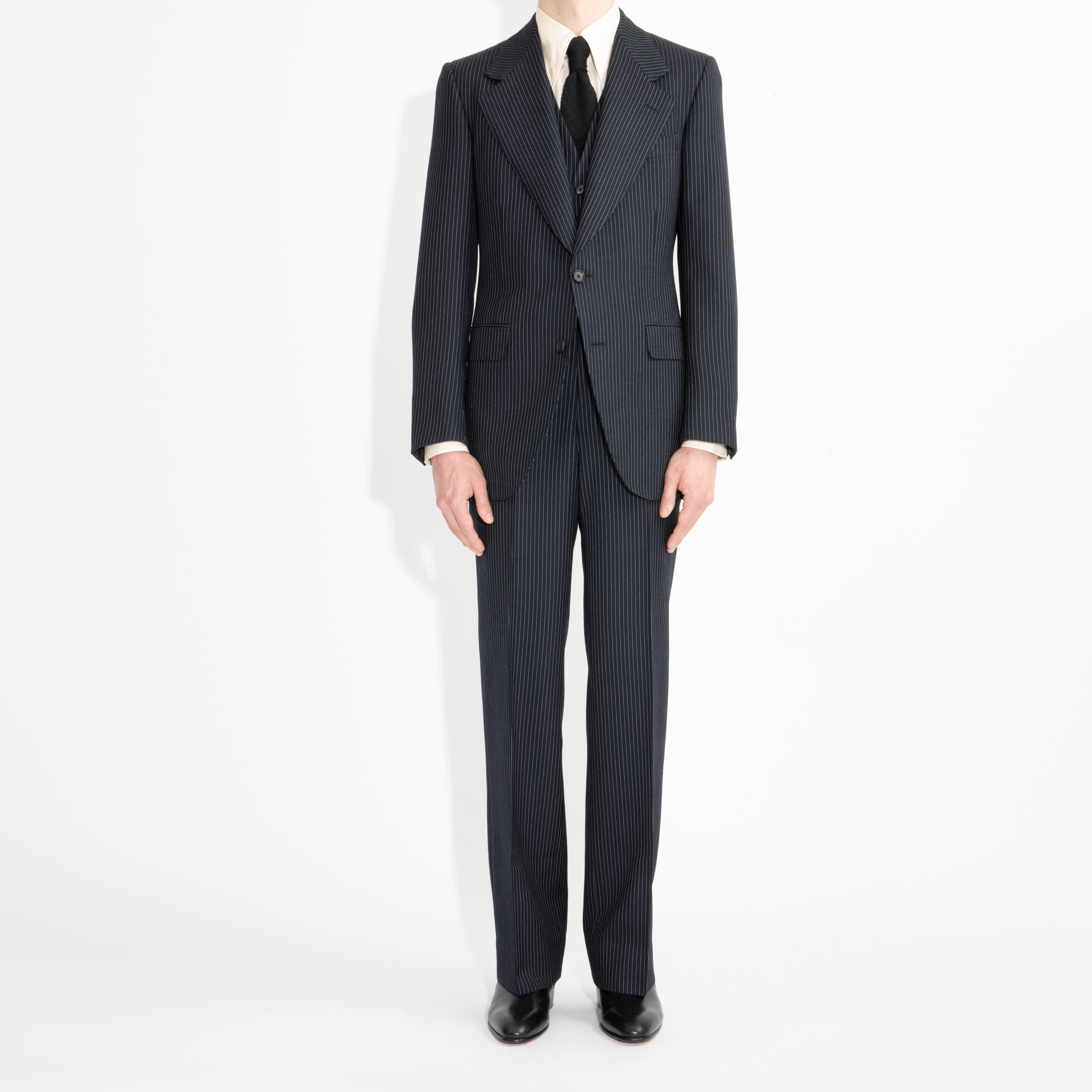 costume droit deux boutons, coupe classique, trois pièces, en sergé de laine anglais