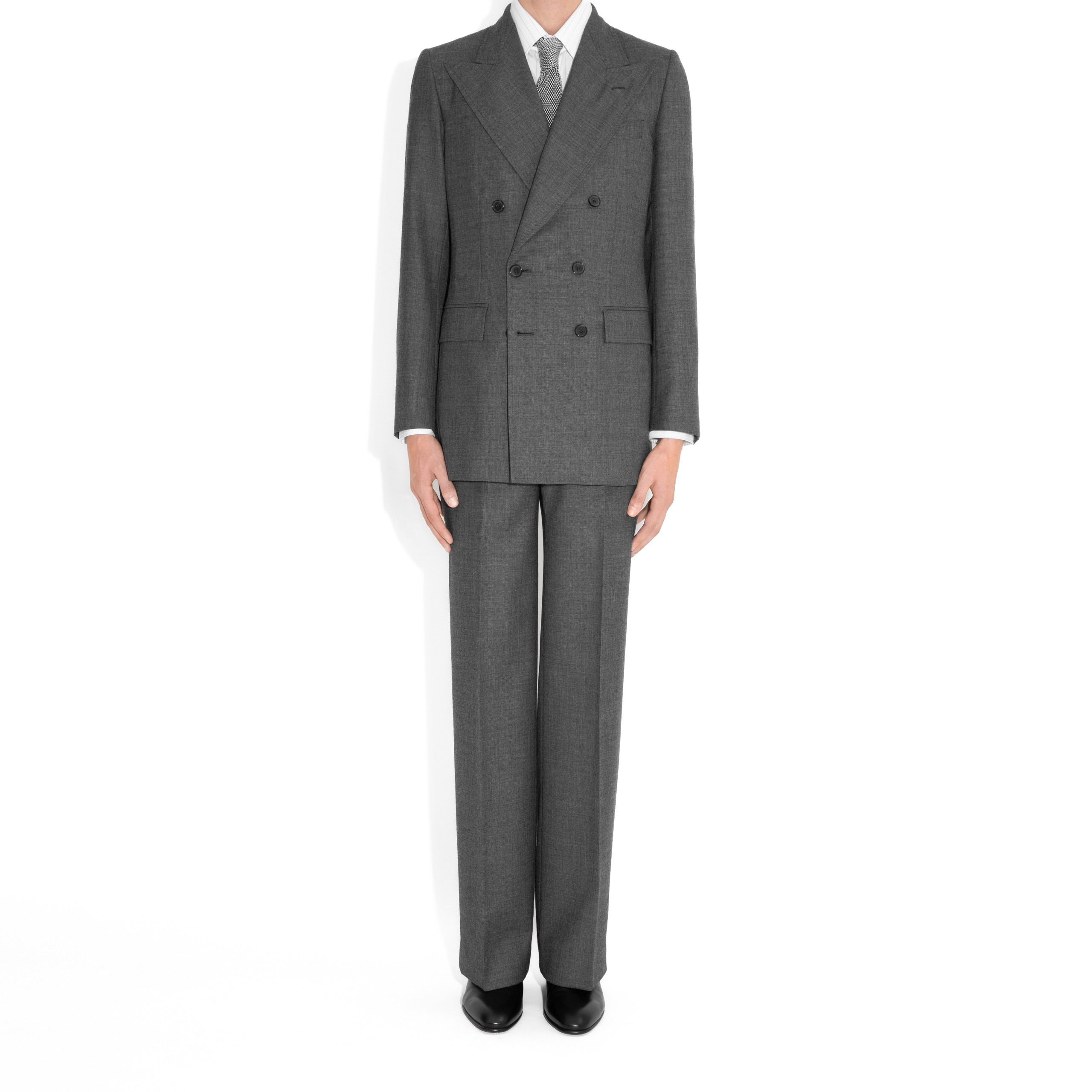 double-breasted six-button suit, classic fit, in English wool sharkskin